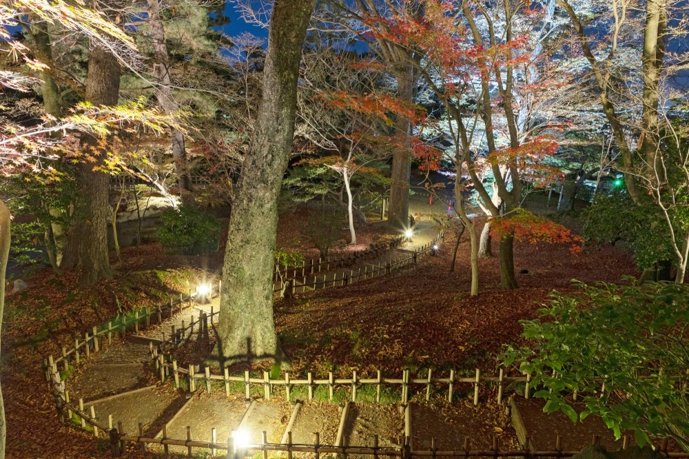 冬の風物詩である「雪吊り」と、赤や黄色へ色づくモミジを鑑賞することができます